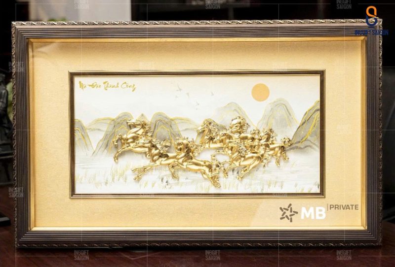 Hướng đến món quà tặng sang trọng, ý nghĩa dịp Tết nguyên Đán cho khách hàng VIP, đối tác. Khách hàng có thể tham khảo mẫu tranh mạ vàng “Mã đáo thành công”. Tranh mạ vàng là sự kết hợp hoàn hảo giữa chất liệu, họa tiết chạm khắc tinh tế, nổi bật với sắc vàng đẳng cấp. Mang đến mẫu quà tặng độc quyền cho doanh nghiệp.