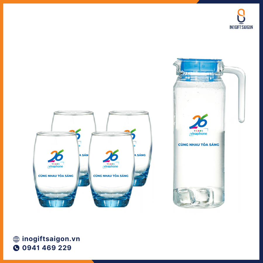 Quà tặng bộ bình 4 ly thủy tinh in logo nổi bật bởi sự tinh tế, thanh lịch gồm: