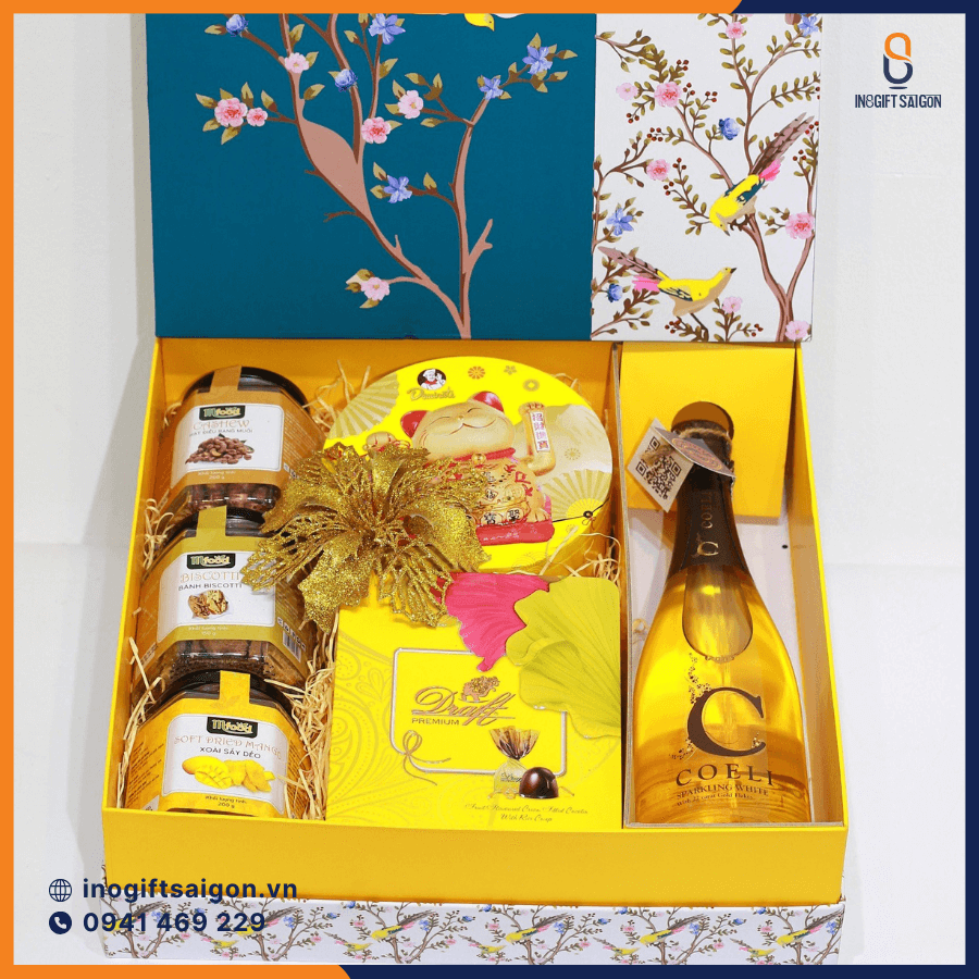 Hộp quà Tết màu vàng: Quà tặng sang trọng Tết Bính ngọ