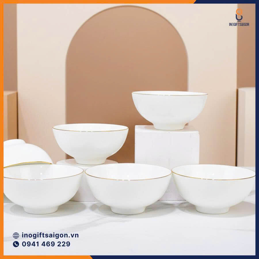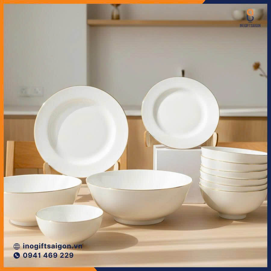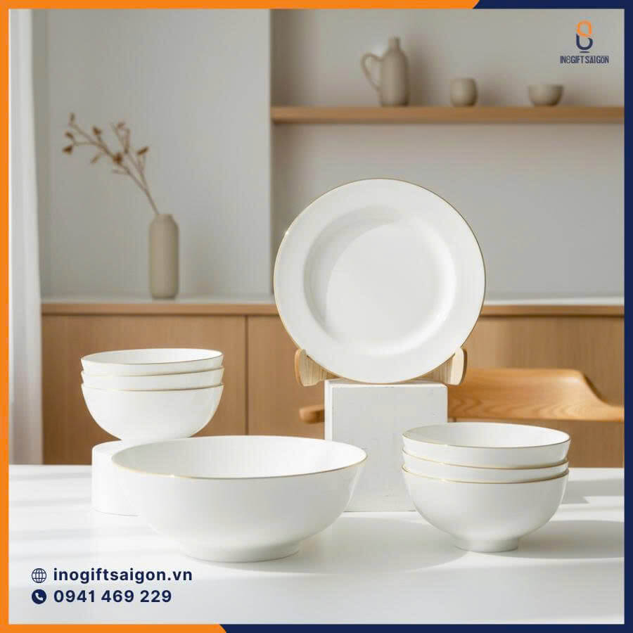 Tron bộ bàn ăn sứ trắng kẻ chỉ vàng in ấn theo yêu cầu